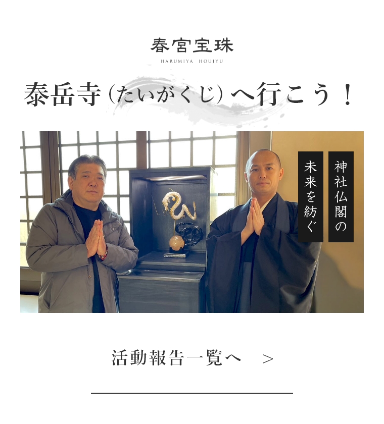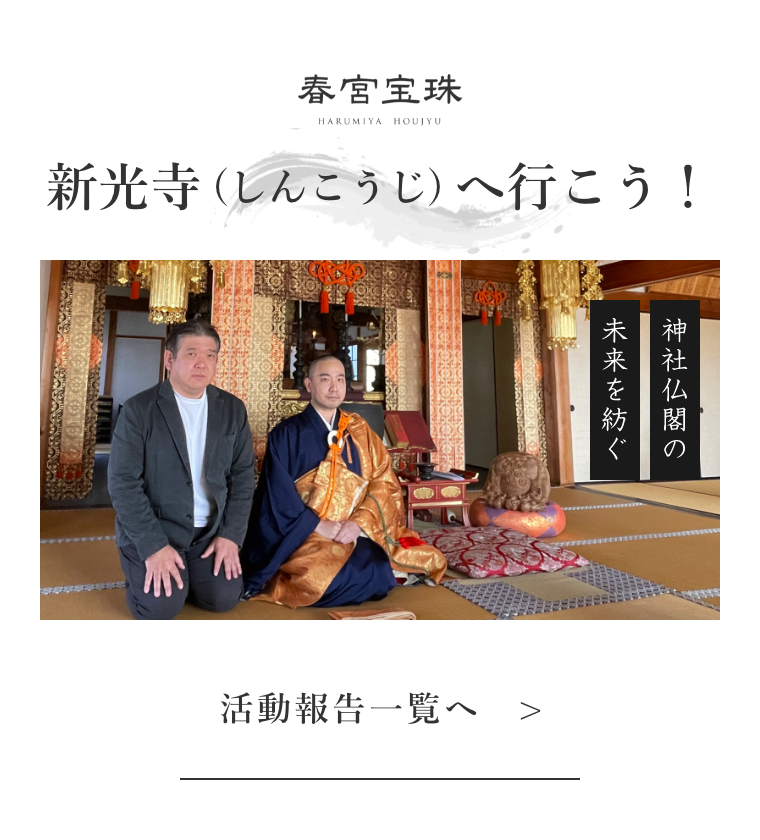 春宮宝珠はお寺や神社の経営支援を通じて、地域活性化や若い世代への文化の継承を目指しています。現在、地域全体で行われるさまざまなプロジェクトに取り組み、龍をテーマにした新たな名物「八大龍」などを通じて、地域社会の発展に貢献しています。地域の皆様と共に力を合わせ、文化の継承と地域の活性化を進めてまいります。