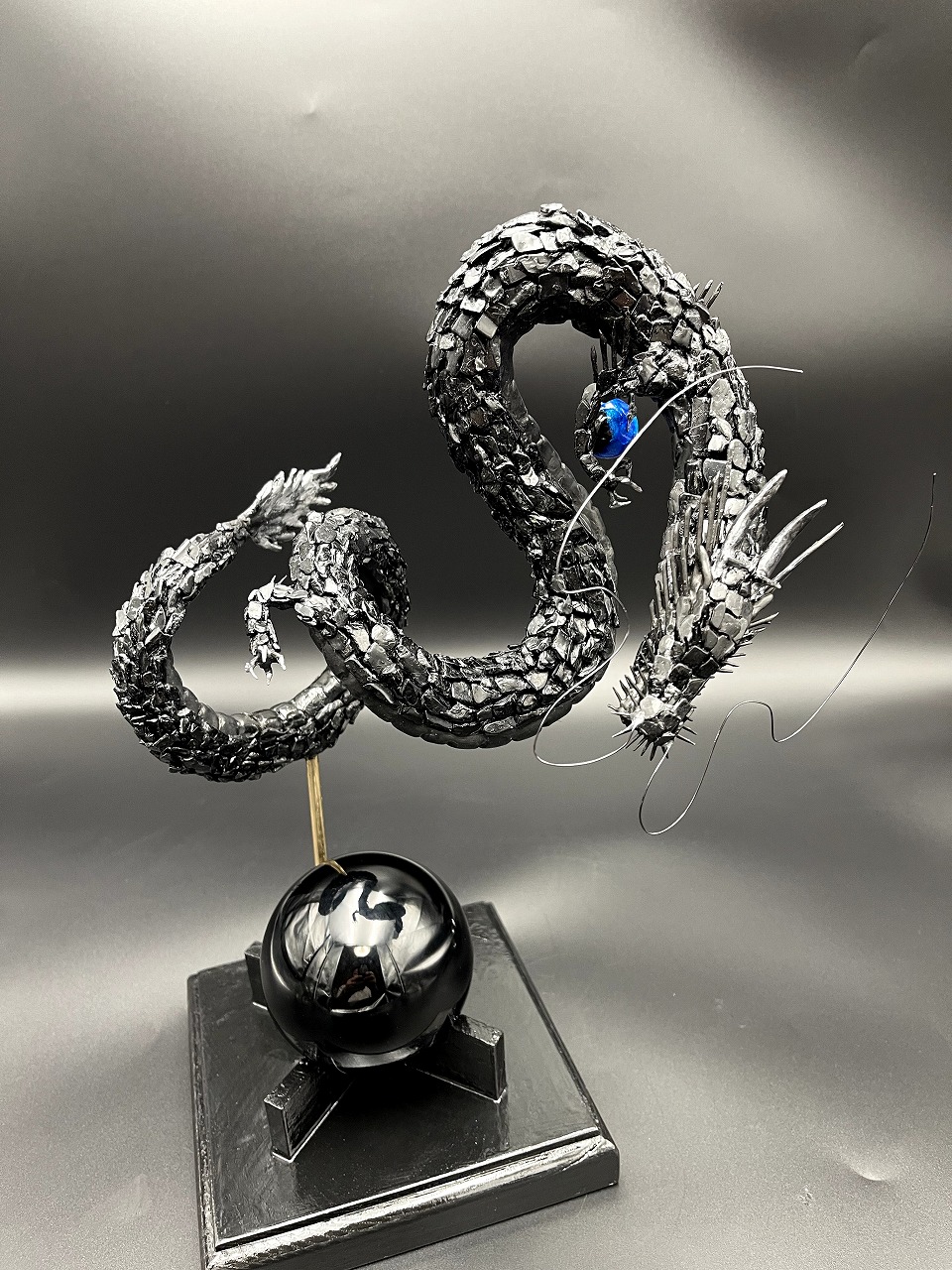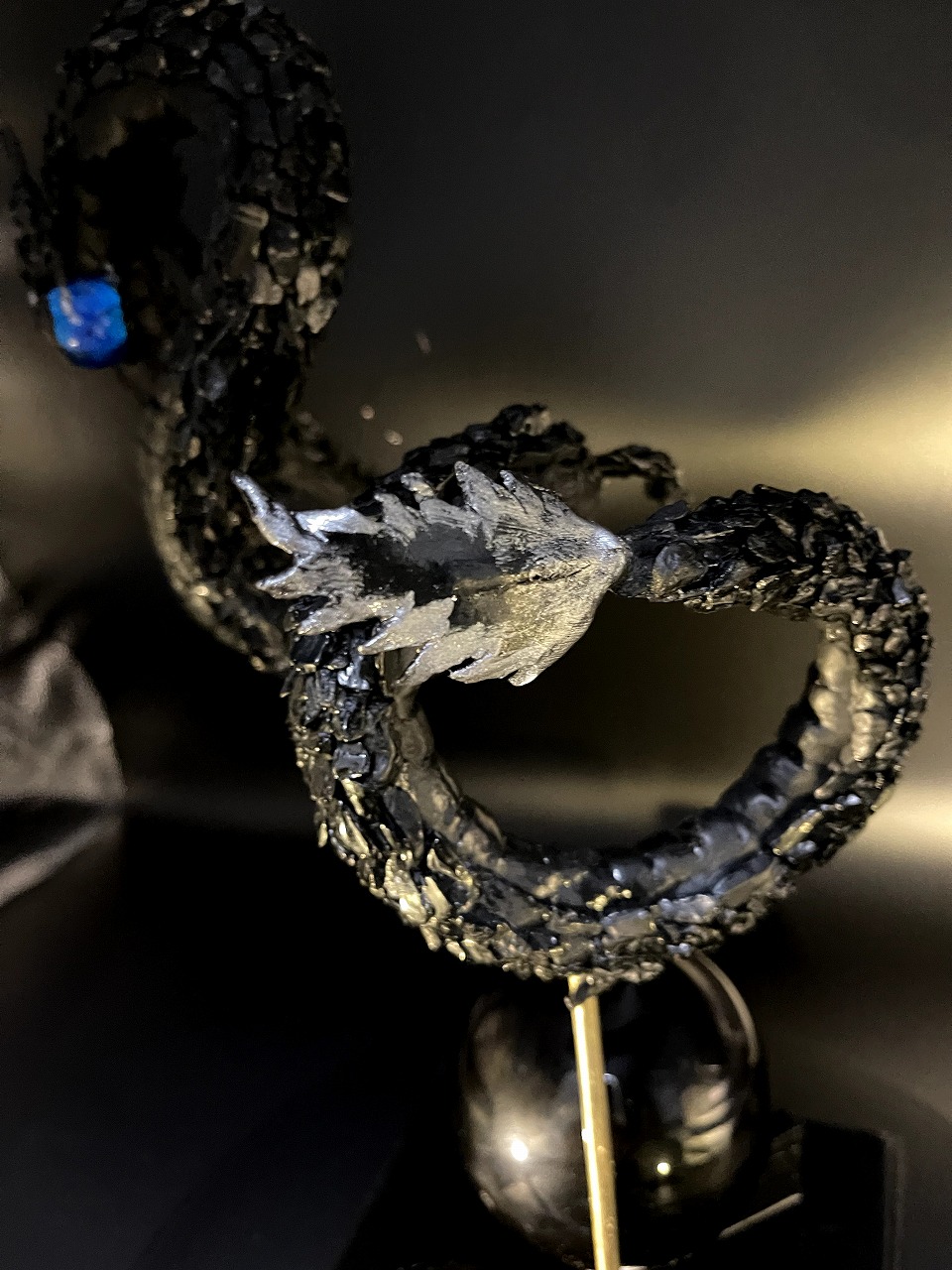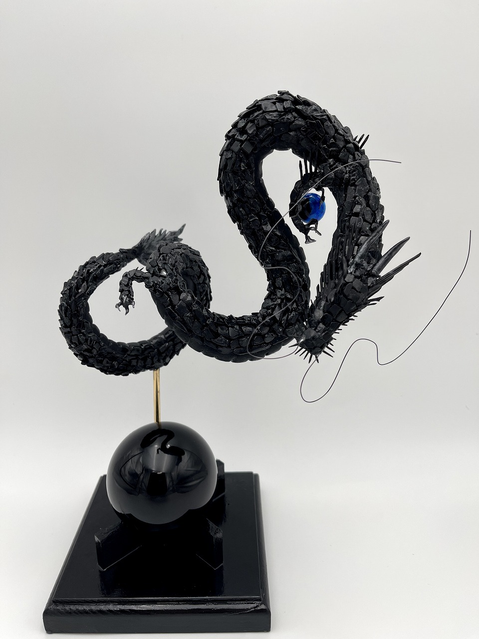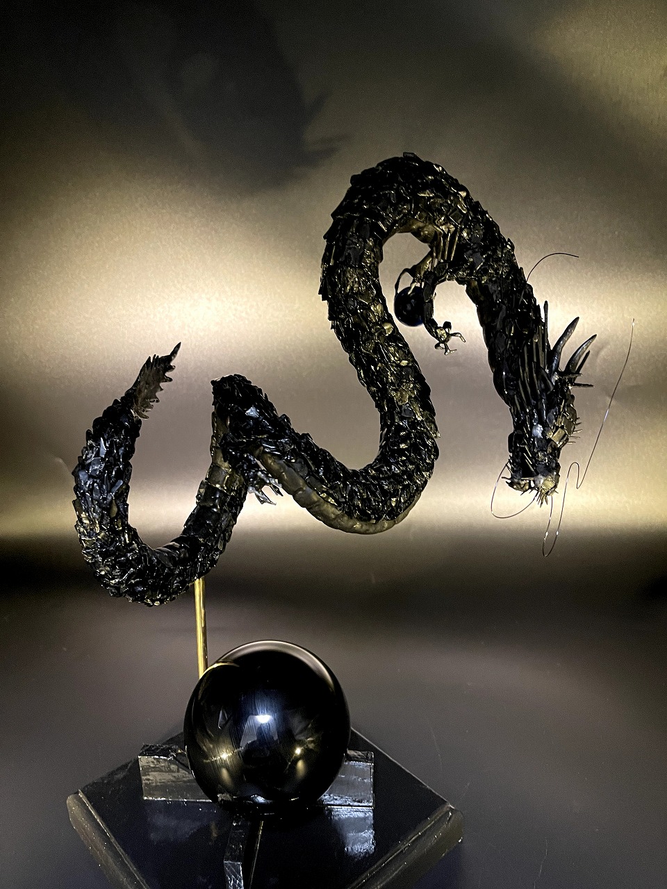 全身の鱗にはブラックトルマリン。大地のエネルギーを湛え、邪気を払い、心を安定へと導く守護の石です。台座に据えた黒曜石(ブラックオブシディアン)は、曇りなき真実を映し出し、強力な防御と決断の力をもたらします。